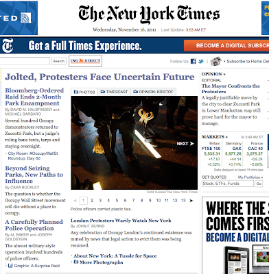 Tuesday, the New York Times and the Washington Post both published accounts of how city officials masterfully orchestrated raids on Occupy Wall Street camps from coast to coast. A story titled "Mayors, police chiefs talk about ways to deal with Occupy Wall Street protests, tent camps," published in the Washington Post, quotes seven government officials. However, only one supporter of the OWS movement is given a voice in the article: