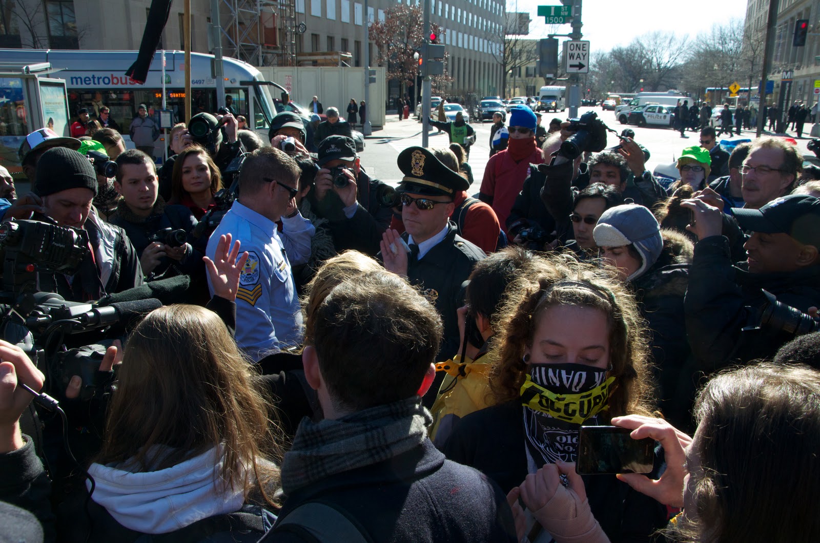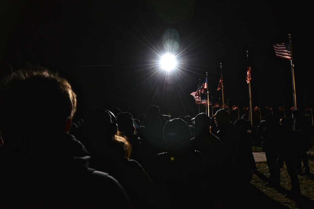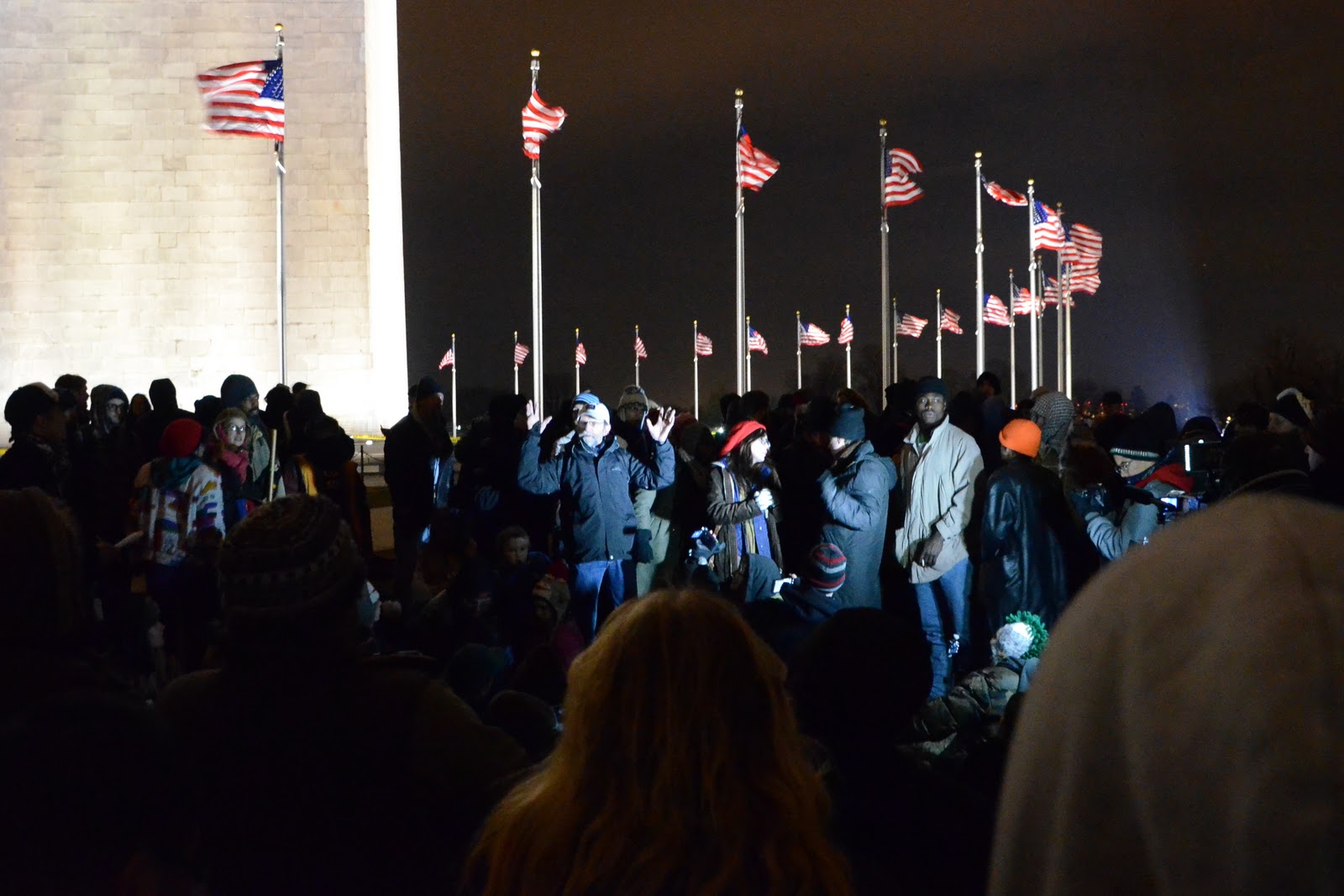 From the monument you could count four helicopters hovering over the city below. President Obama had been moving around town. One helicopter approached the monument every ten minutes only to back off before it got really close. After the passing of the motorcade along 17th Street adjacent to the World War II memorial below, only this helicopter remained in the sky. Suddenly it flew over the protesters and shone its spotlight directly on the gathering. Protesters turned to face the light.