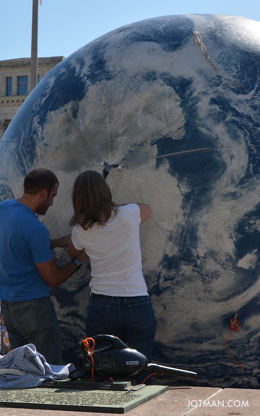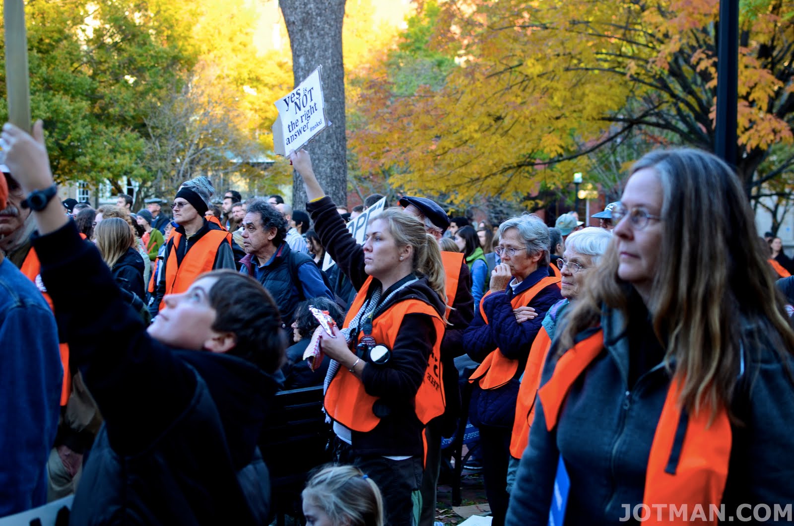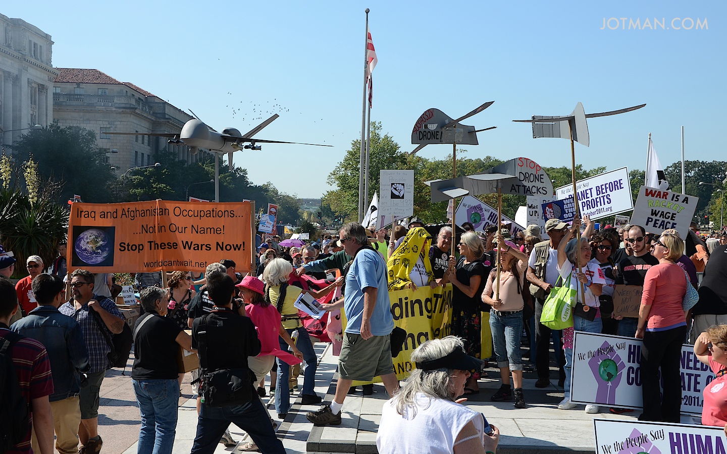 From the monument you could count four helicopters hovering over the city below. President Obama had been moving around town. One helicopter approached the monument every ten minutes only to back off before it got really close. After the passing of the motorcade along 17th Street adjacent to the World War II memorial below, only this helicopter remained in the sky. Suddenly it flew over the protesters and shone its spotlight directly on the gathering. Protesters turned to face the light.