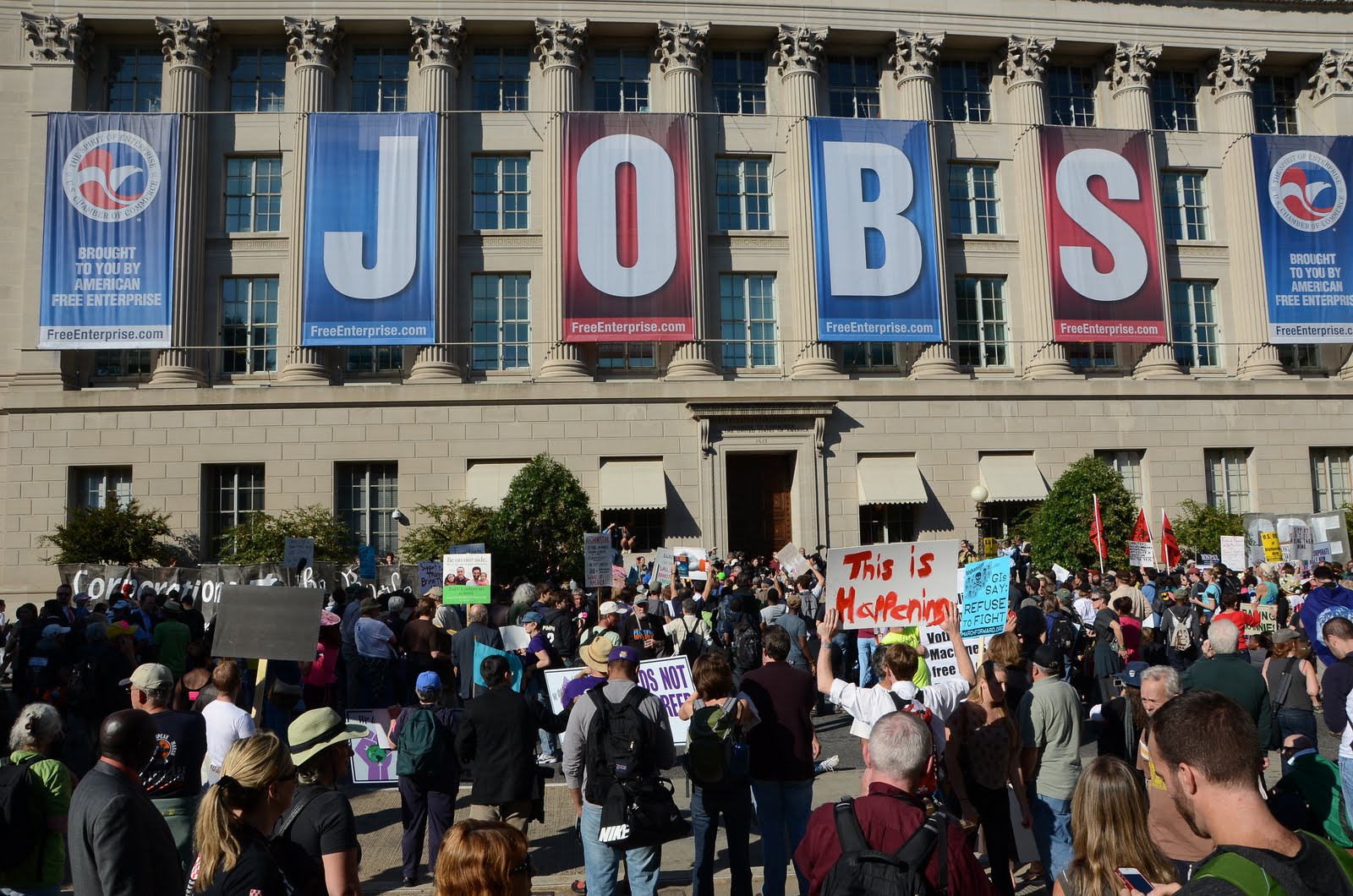 The Chamber of Commerce lobbies hard for deregulation on behalf of the country's largest corporations. On the front side of the building facing the White House are massive signs that spell out the word "JOBS."